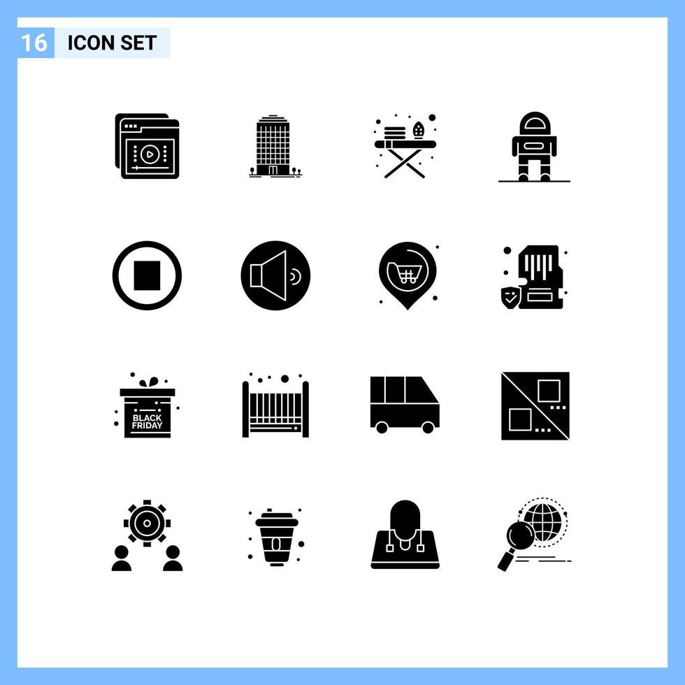 16 Universal Solid Glyphs Set for Web and Mobile Applications media space tower robot ironing tools Editable Vector Design Elements Free Vector