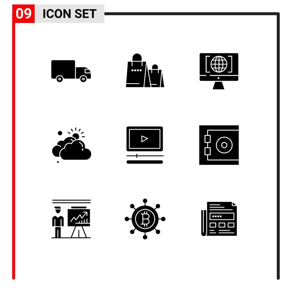Mobile Interface Solid Glyph Set of 9 Pictograms of player sun computer day cloud Editable Vector Design Elements
