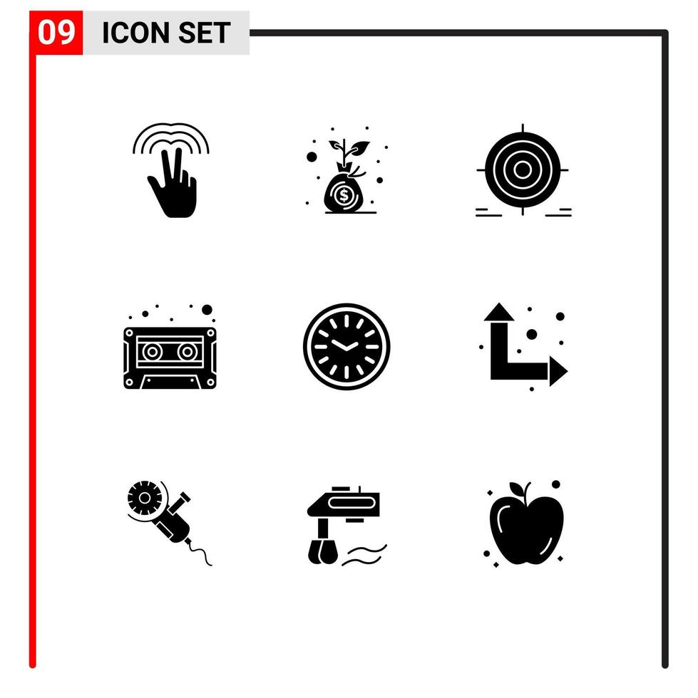 Pictogram Set of 9 Simple Solid Glyphs of clock cassette target audio cassette objective Editable Vector Design Elements