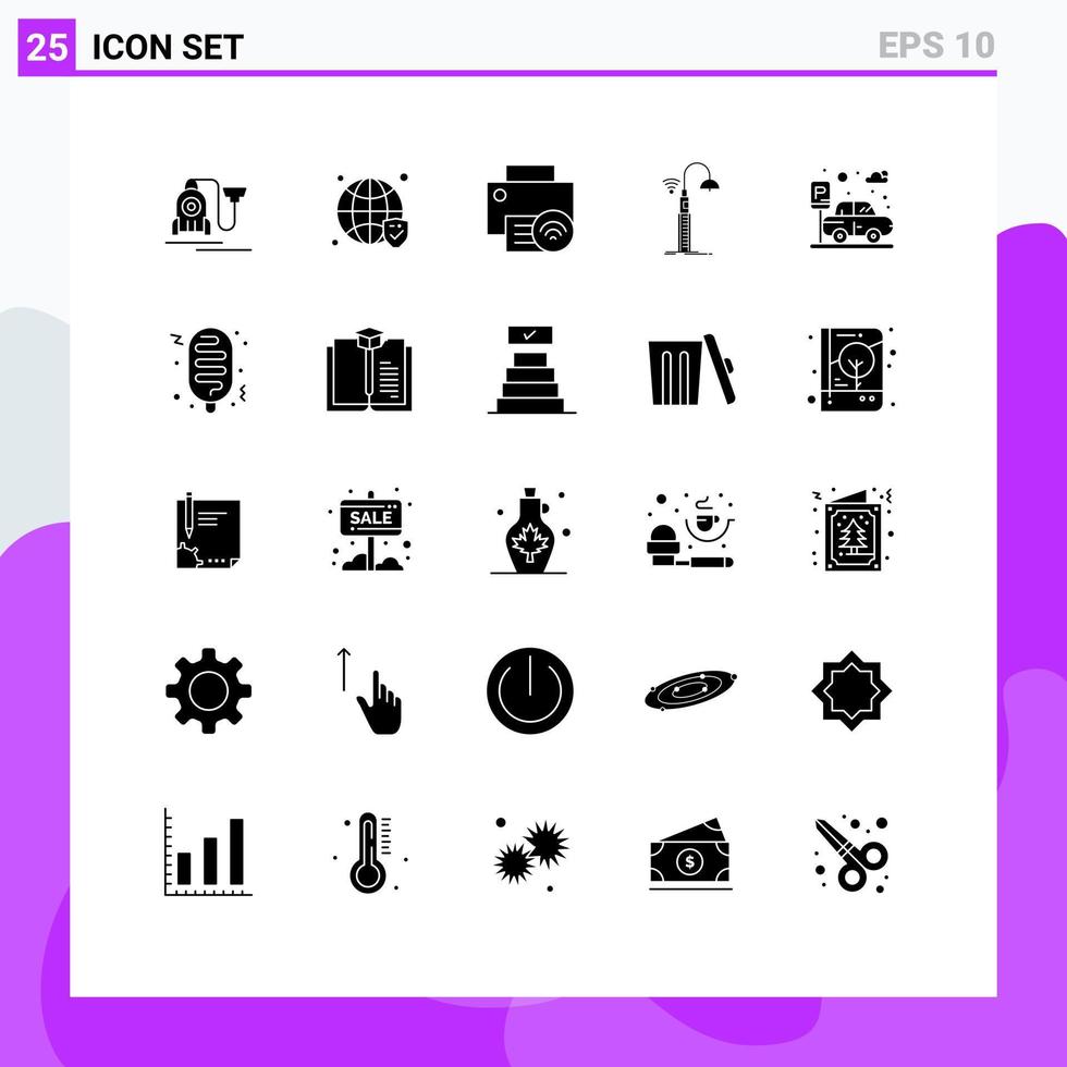 Set of 25 Vector Solid Glyphs on Grid for technology wifi computers street printer Editable Vector Design Elements