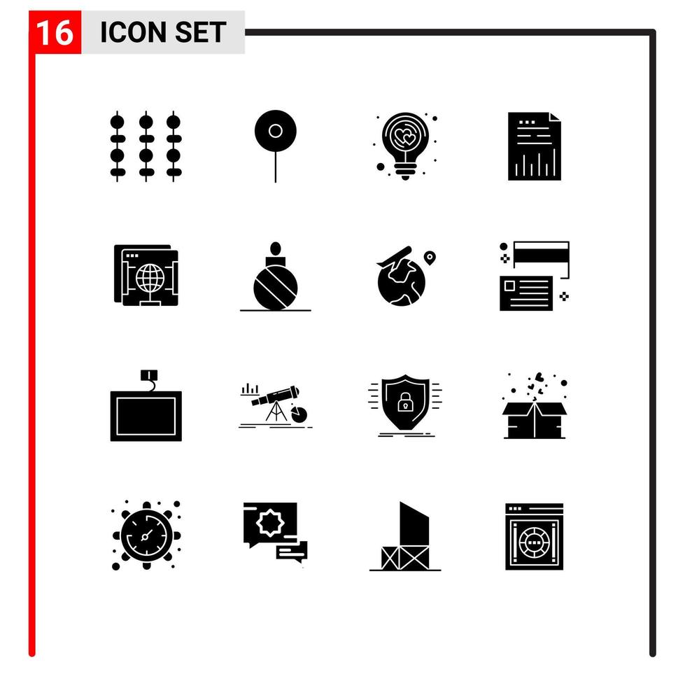 Group of 16 Modern Solid Glyphs Set for brower file energy document analytics Editable Vector Design Elements