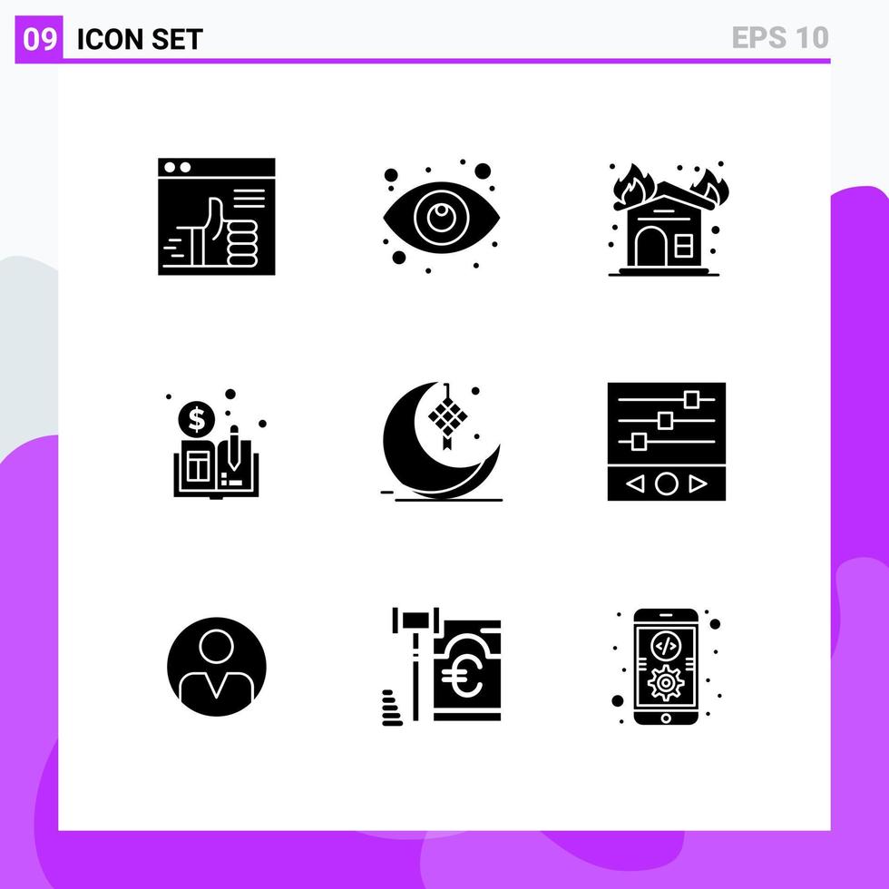 Set of 9 Vector Solid Glyphs on Grid for cresent distributed ledger book view distributed firehouse Editable Vector Design Elements