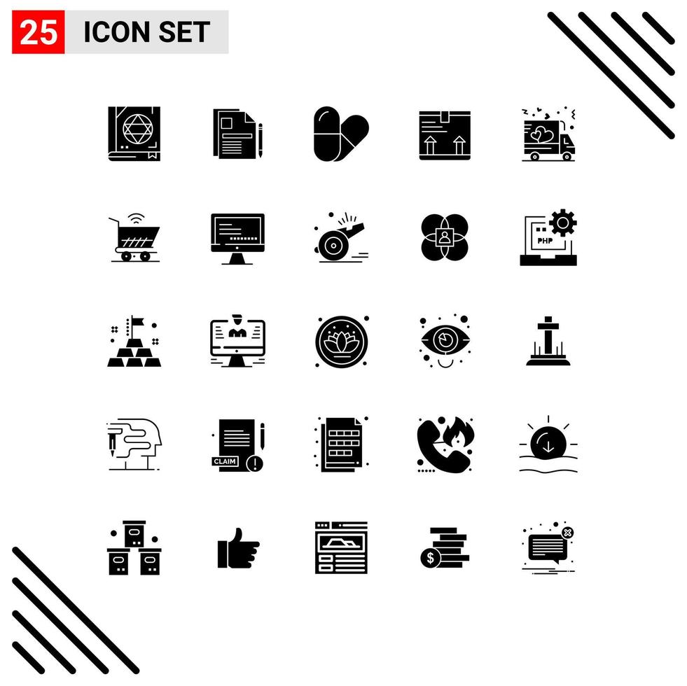 25 Universal Solid Glyphs Set for Web and Mobile Applications shipping delivery sign contract up box Editable Vector Design Elements