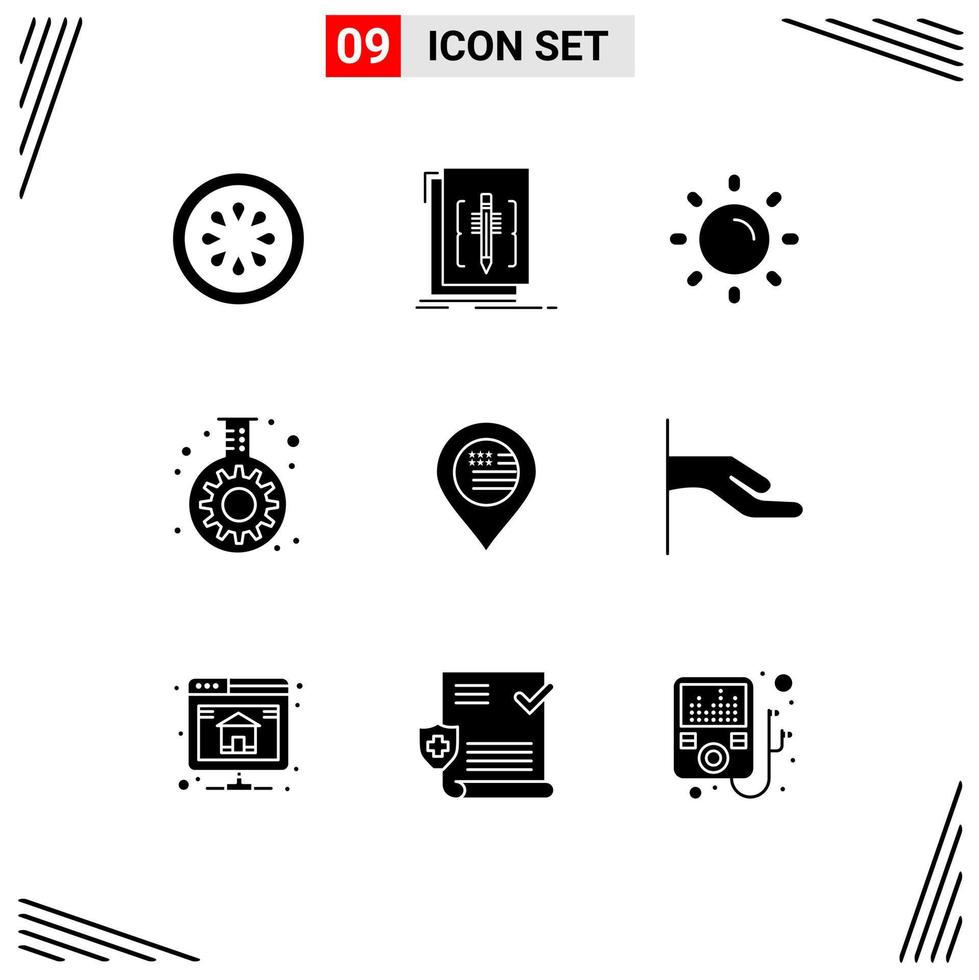 Editable Vector Line Pack of 9 Simple Solid Glyphs of american gear program flask shine Editable Vector Design Elements Free Vector