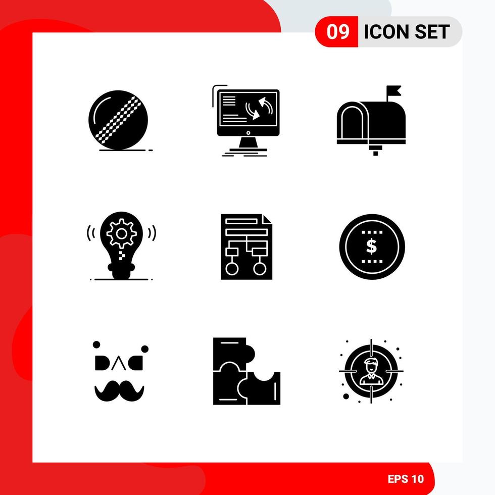 Editable Vector Line Pack of 9 Simple Solid Glyphs of setting idea computer bulb email Editable Vector Design Elements