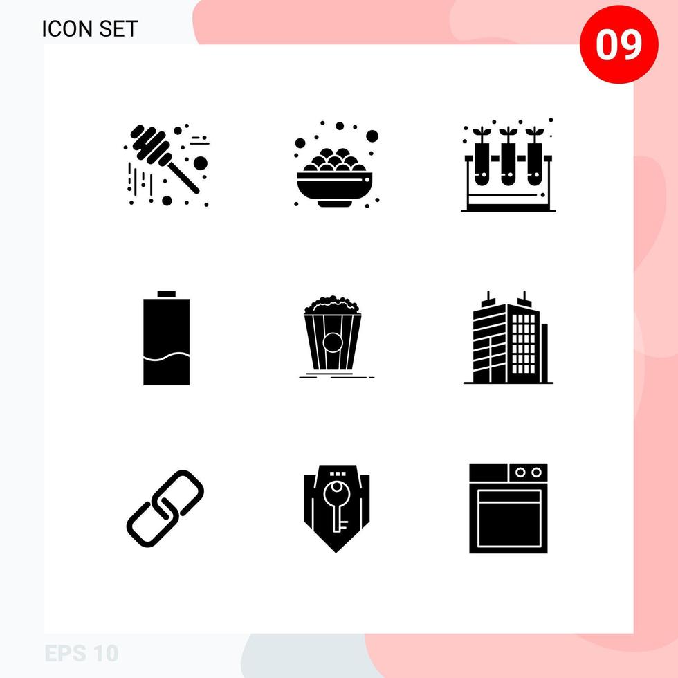 Group of 9 Modern Solid Glyphs Set for popcorn energy lab electricity battery Editable Vector Design Elements