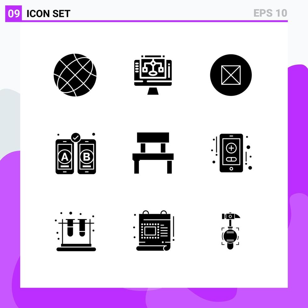 Mobile Interface Solid Glyph Set of 9 Pictograms of garden bench computer mobile development Editable Vector Design Elements