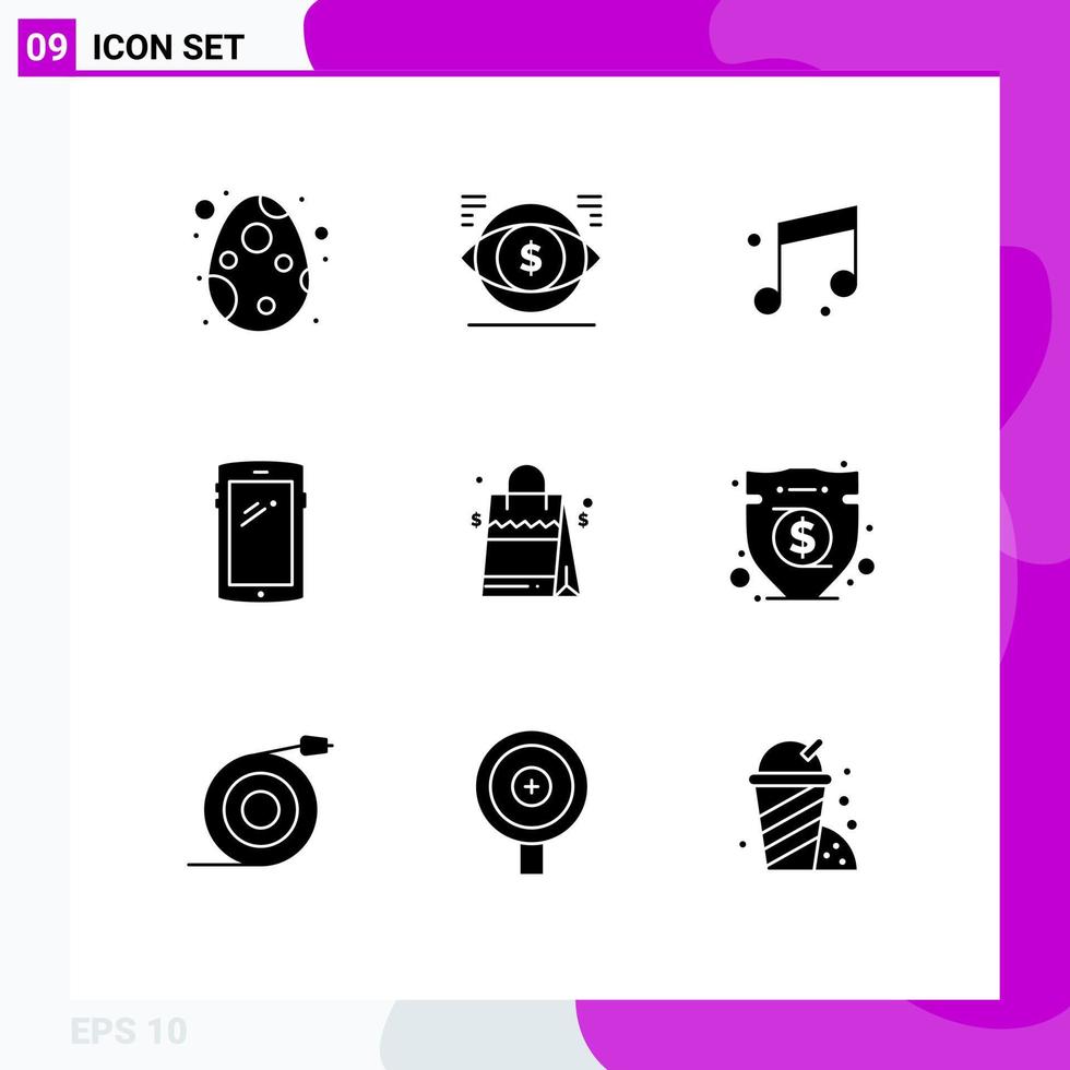 Editable Vector Line Pack of 9 Simple Solid Glyphs of bag android vision mobile phone Editable Vector Design Elements