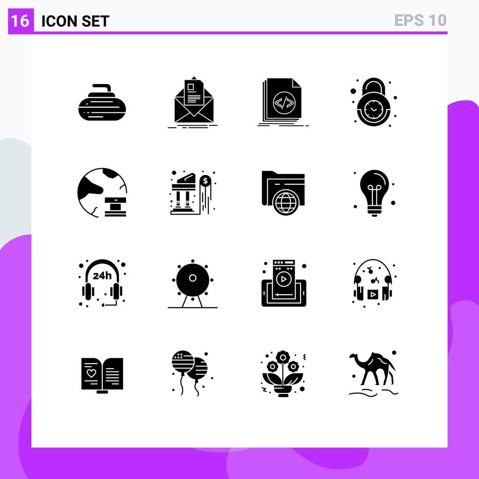 Group of 16 Modern Solid Glyphs Set for secure clock briefing alarm programming Editable Vector Design Elements