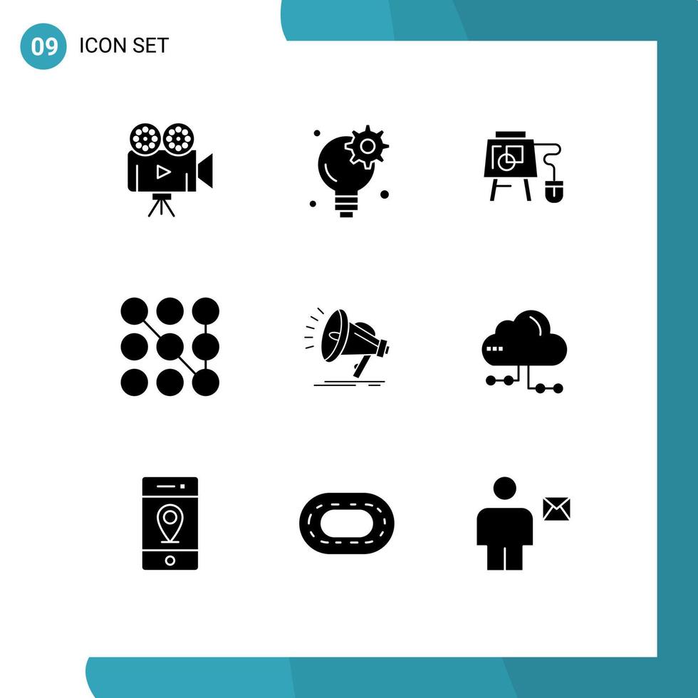 Set of 9 Vector Solid Glyphs on Grid for audio speaker mouse security lock Editable Vector Design Elements Free Vector
