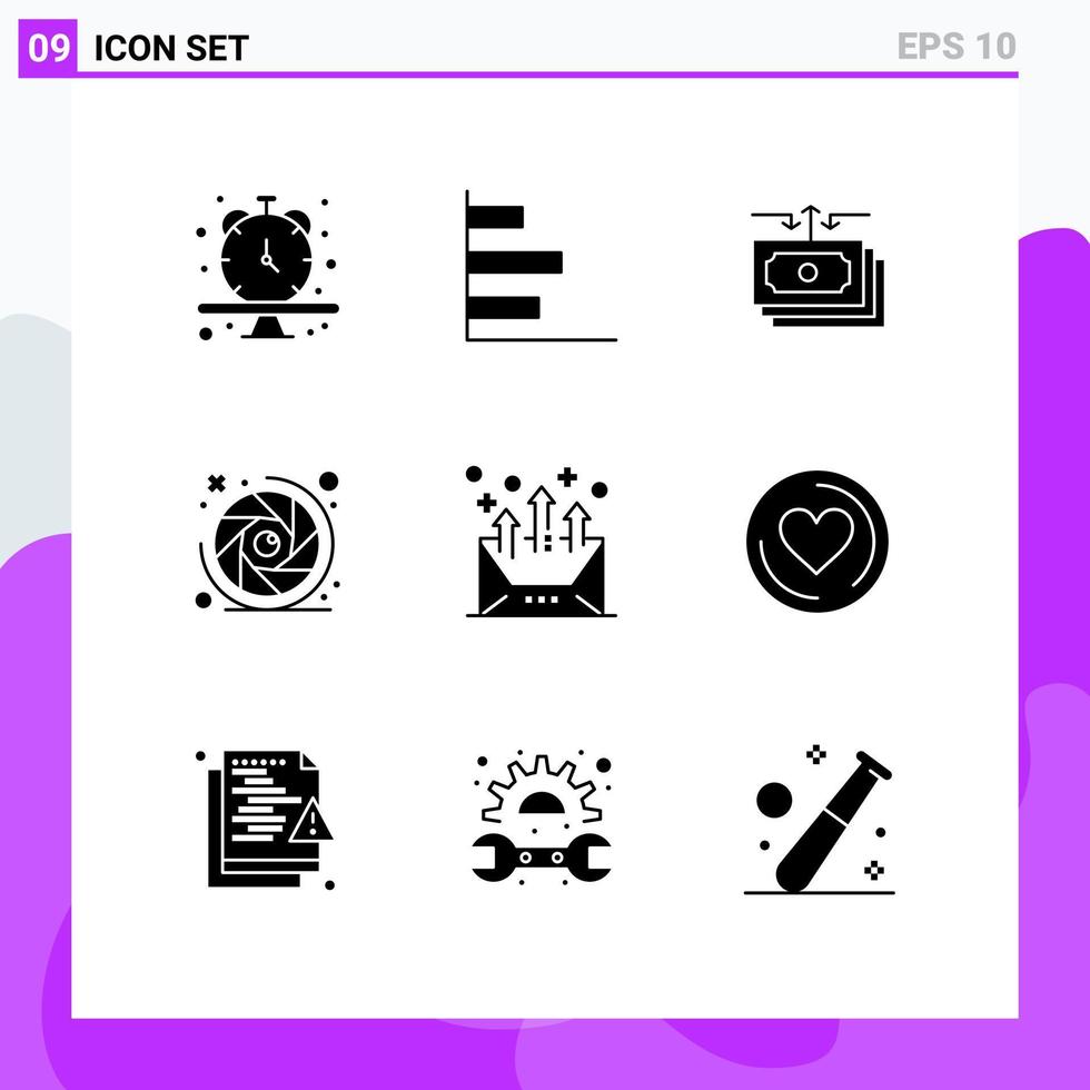 Group of 9 Solid Glyphs Signs and Symbols for address camera shutter dollar camera lens report Editable Vector Design Elements