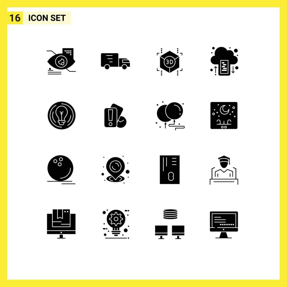 Set of 16 Vector Solid Glyphs on Grid for circle bulb cube upload drive Editable Vector Design Elements