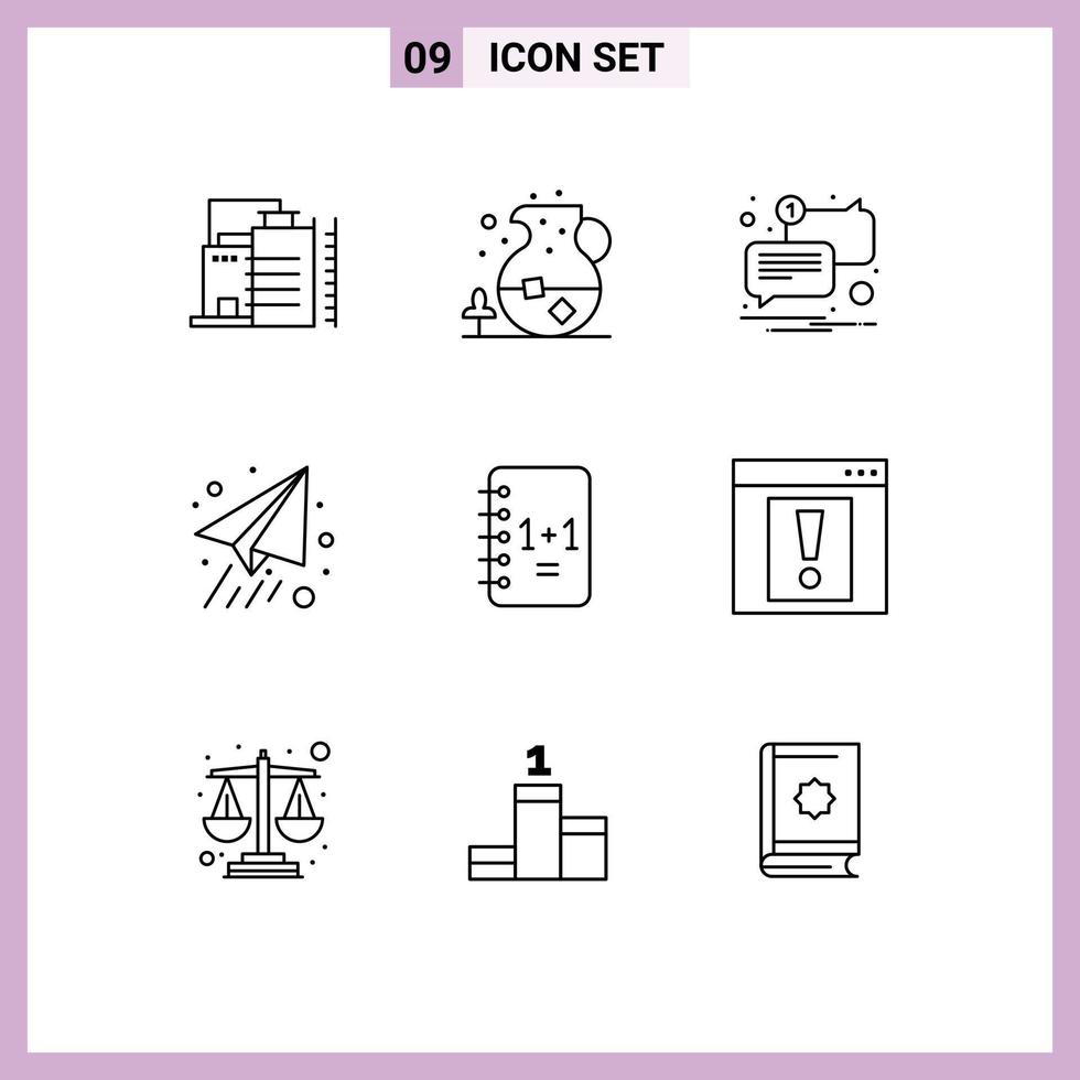 Mobile Interface Outline Set of 9 Pictograms of notepad education chat plane paper Editable Vector Design Elements