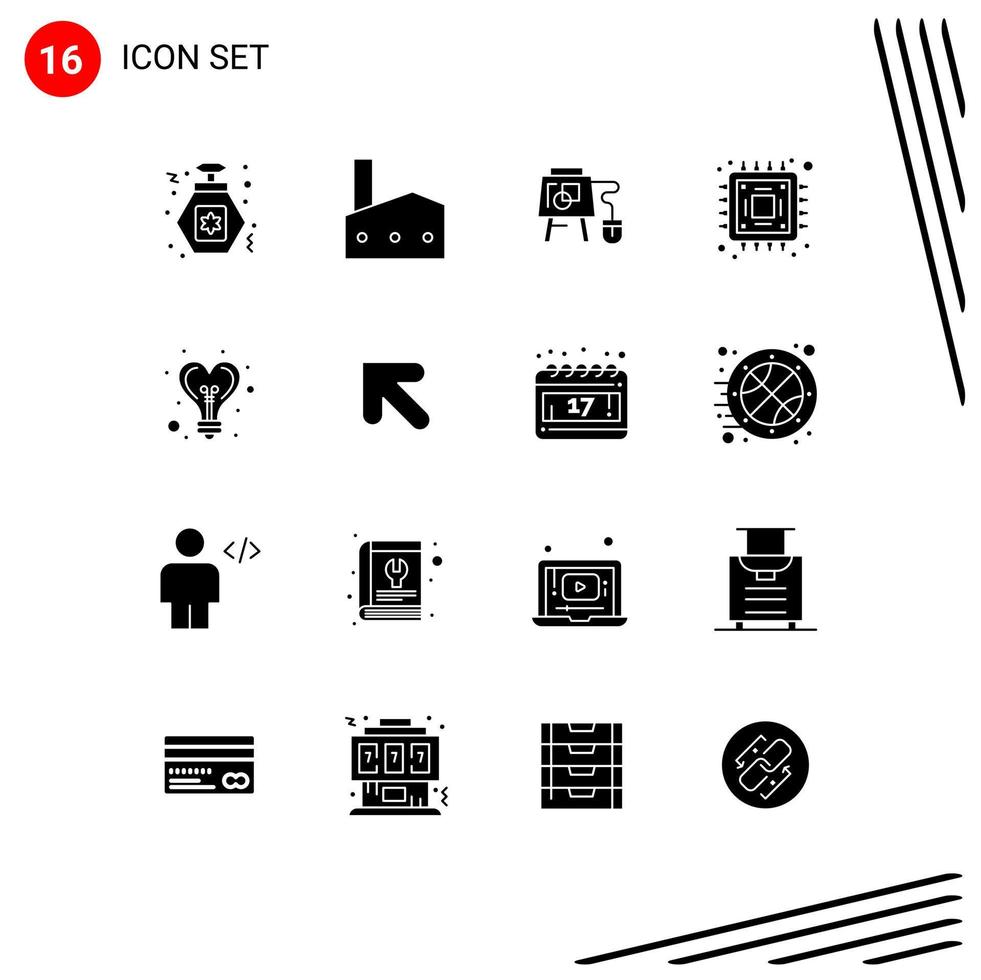 Editable Vector Line Pack of 16 Simple Solid Glyphs of light bulb mouse microchip chip Editable Vector Design Elements