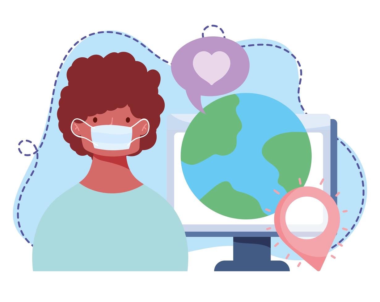 online training, boy with medical mask world computer, courses knowledge development using internet Free Vector