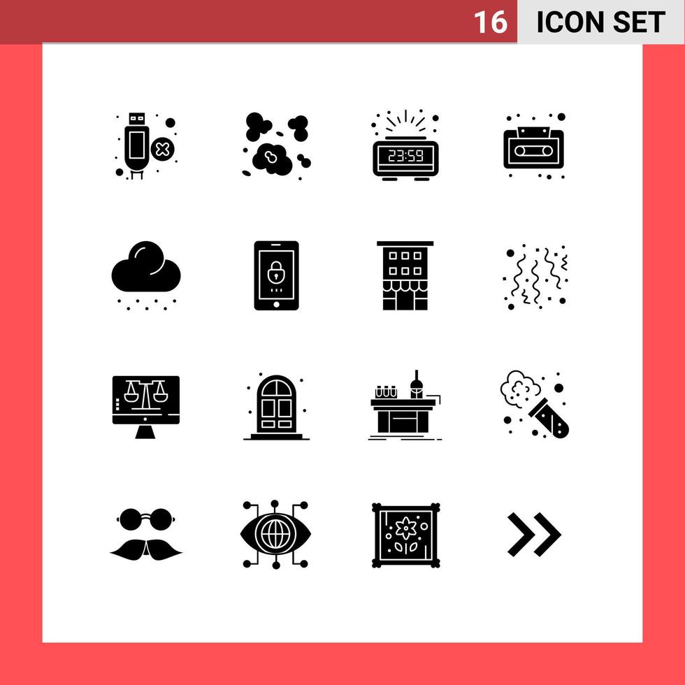 Pictogram Set of 16 Simple Solid Glyphs of weather cloud count down tape audio cassette Editable Vector Design Elements