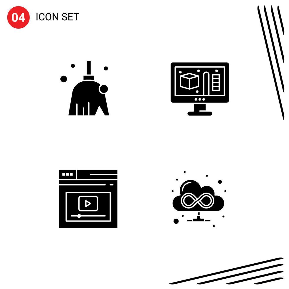 Mobile Interface Solid Glyph Set of 4 Pictograms of broom web sweep modeling video Editable Vector Design Elements