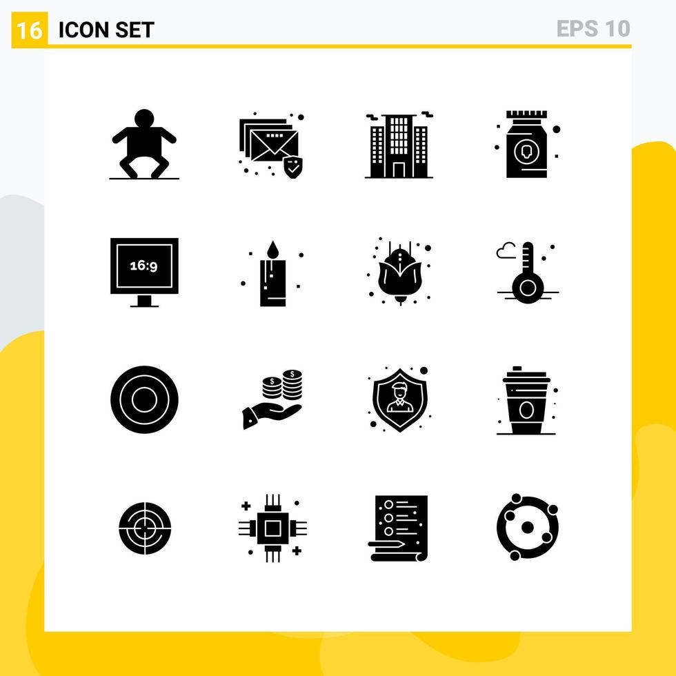 16 Universal Solid Glyphs Set for Web and Mobile Applications candle display place aspect ratio pharmacy Editable Vector Design Elements Free Vector