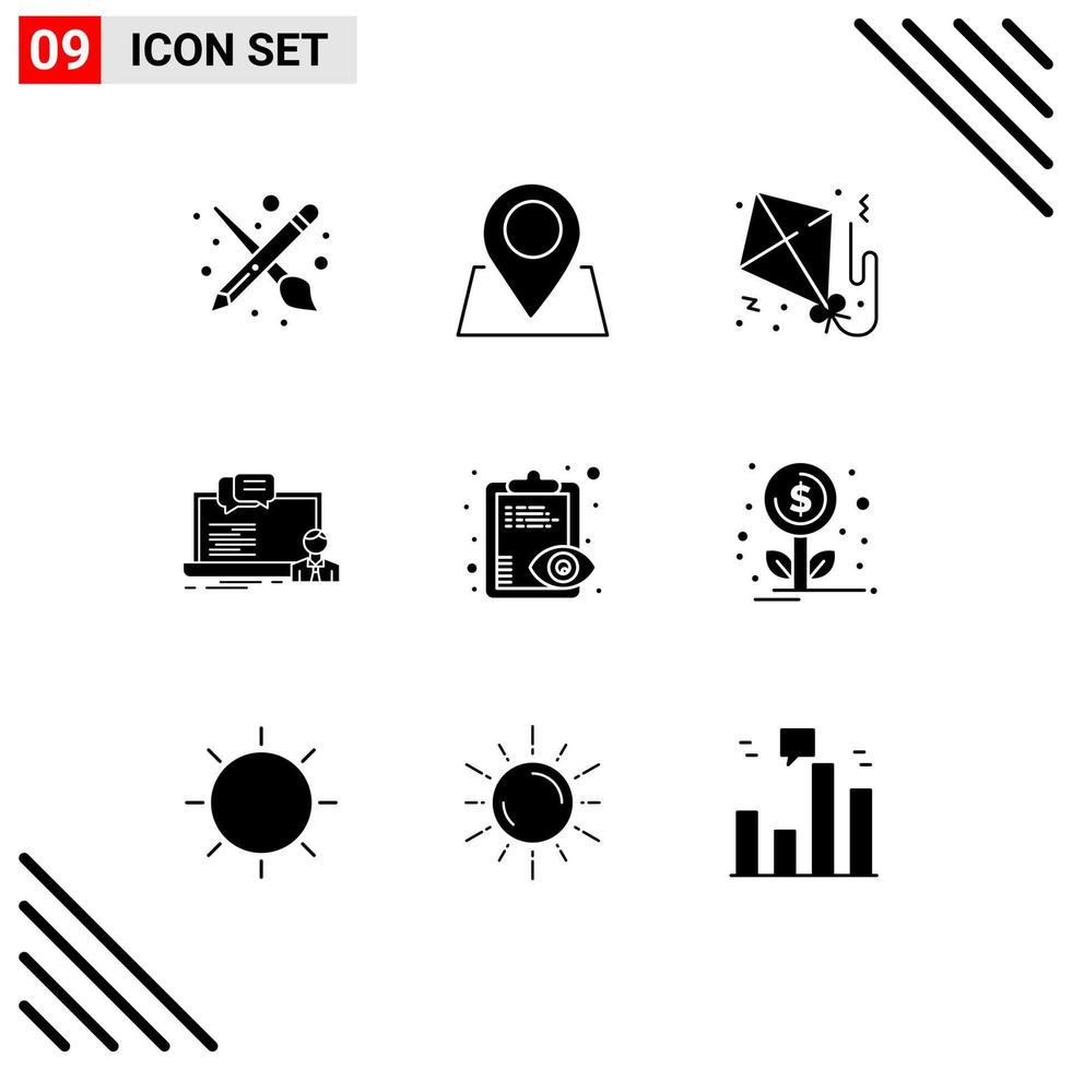 Mobile Interface Solid Glyph Set of 9 Pictograms of overview chat flying computer course Editable Vector Design Elements