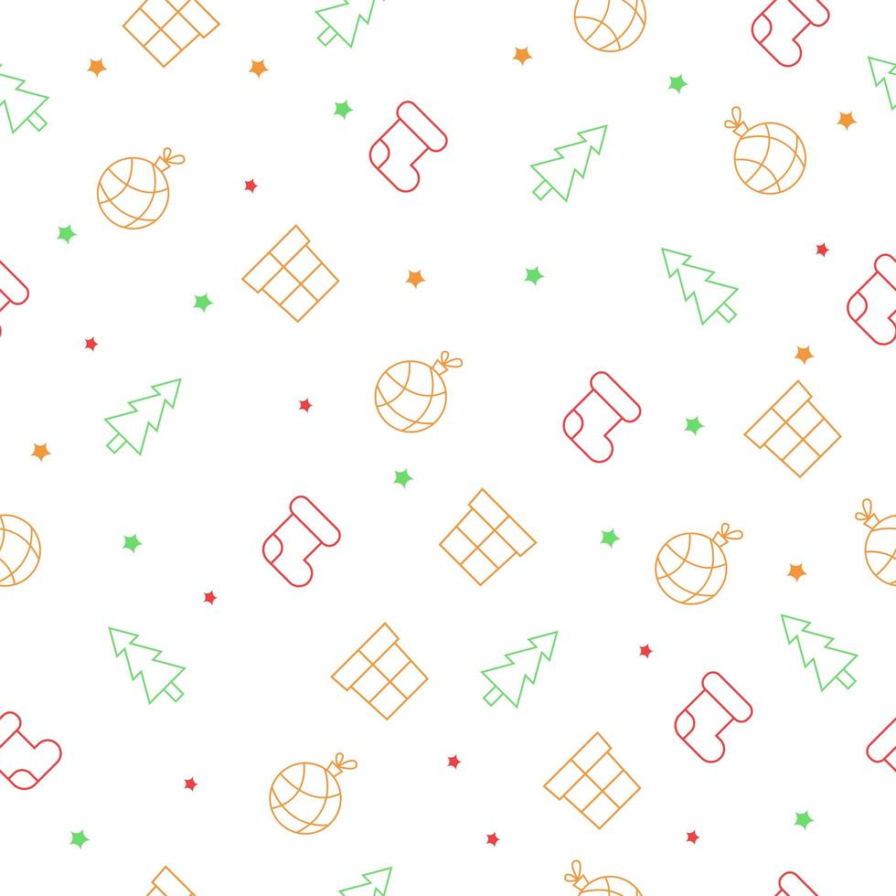 Seamless Christmas pattern with christmas tree, socks, gitf boxes, stars and tree balls Pro Vector