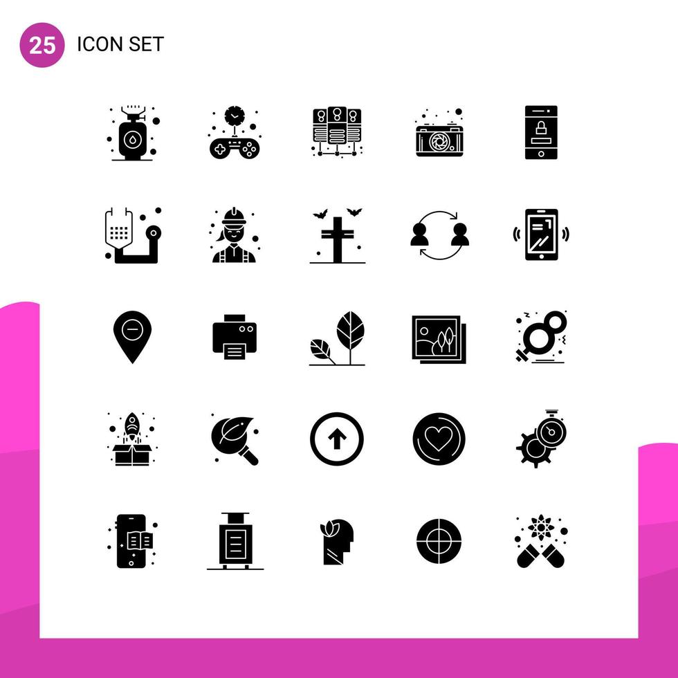 Pack of 25 Modern Solid Glyphs Signs and Symbols for Web Print Media such as security locked database server picture photography Editable Vector Design Elements