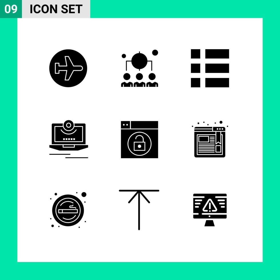 Universal Icon Symbols Group of 9 Modern Solid Glyphs of video computer management camera layout Editable Vector Design Elements