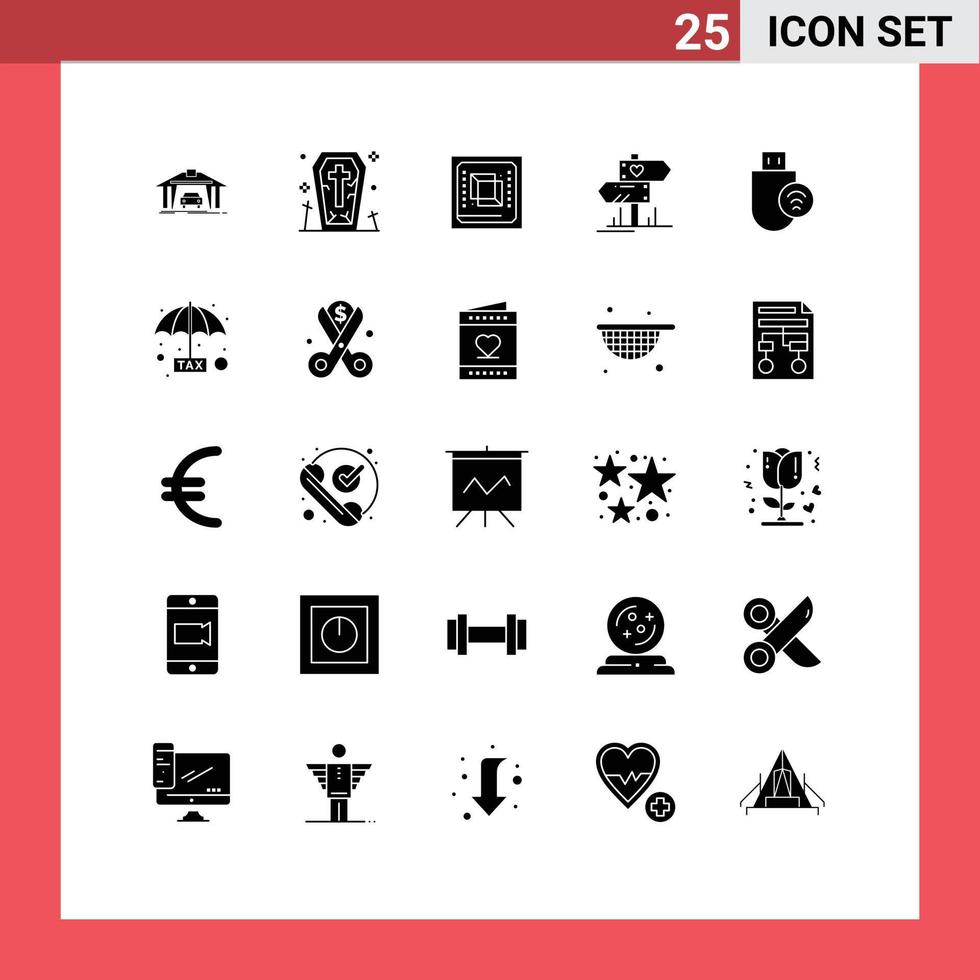 Group of 25 Modern Solid Glyphs Set for computers heart chip love processor Editable Vector Design Elements