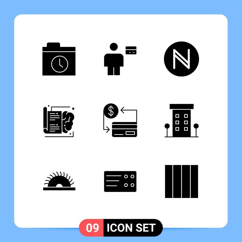 User Interface Pack of 9 Basic Solid Glyphs of cashless card blockchain learning brain Editable Vector Design Elements Free Vector