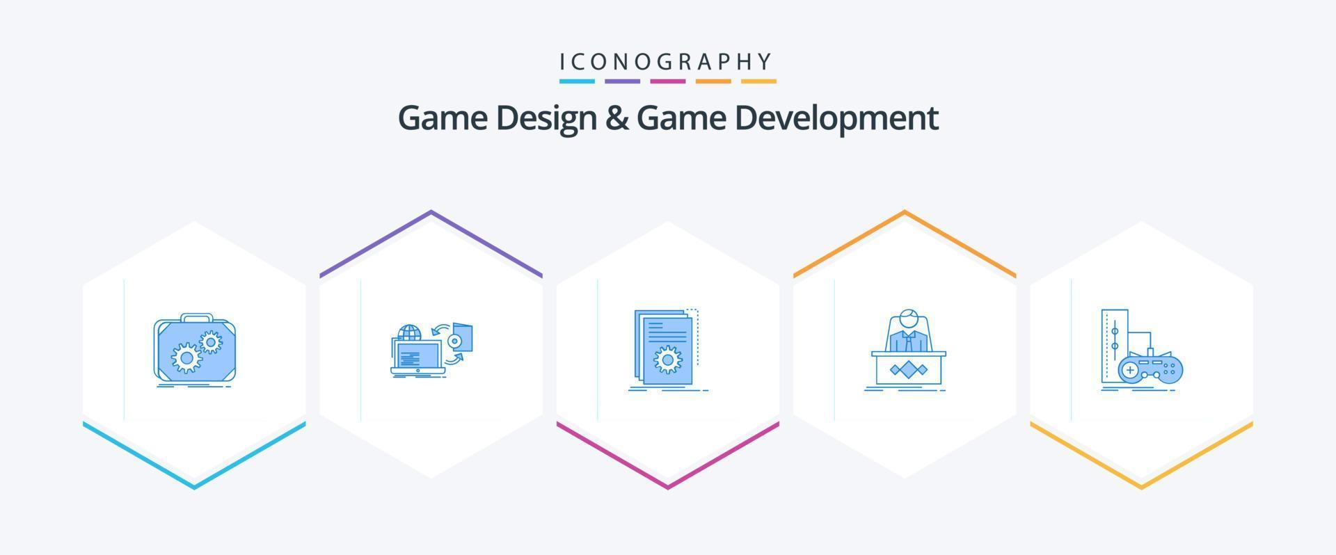 Game Design And Game Development 25 Blue icon pack including legend. game. publish. script. developer vector