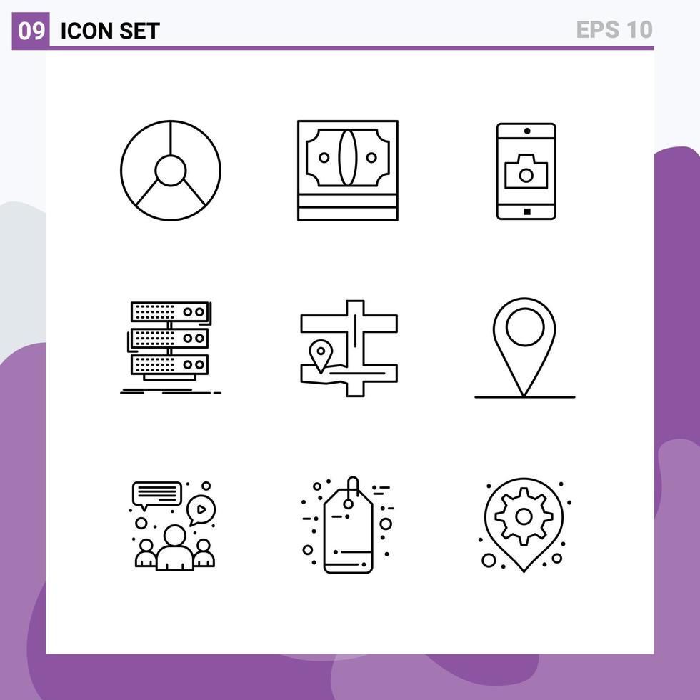 Pack of 9 Modern Outlines Signs and Symbols for Web Print Media such as database storage money server mobile application Editable Vector Design Elements