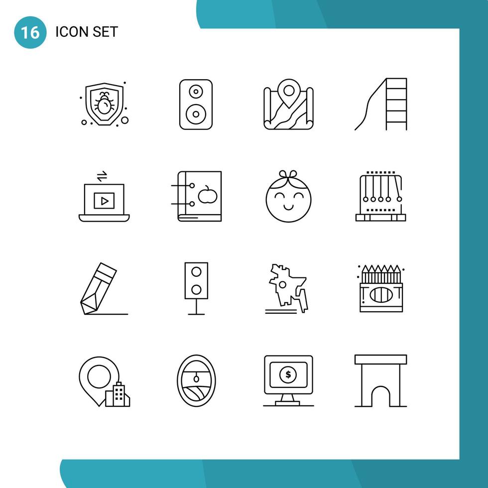 User Interface Pack of 16 Basic Outlines of share laptop location slide child Editable Vector Design Elements