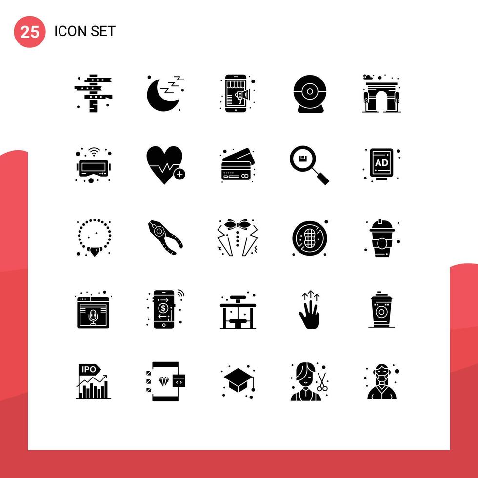 Pack of 25 Modern Solid Glyphs Signs and Symbols for Web Print Media such as door architecture online security camera Editable Vector Design Elements