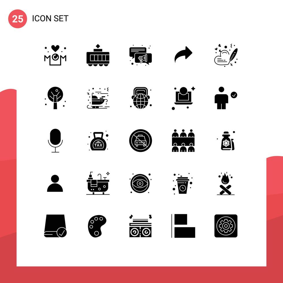 Pack of 25 Modern Solid Glyphs Signs and Symbols for Web Print Media such as pen heart conversation forward direction Editable Vector Design Elements