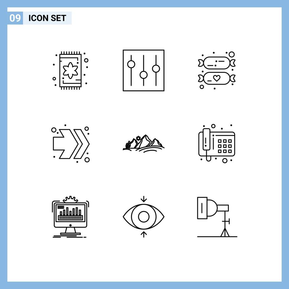 Pack of 9 Modern Outlines Signs and Symbols for Web Print Media such as landscape right user fast forward sweets Editable Vector Design Elements