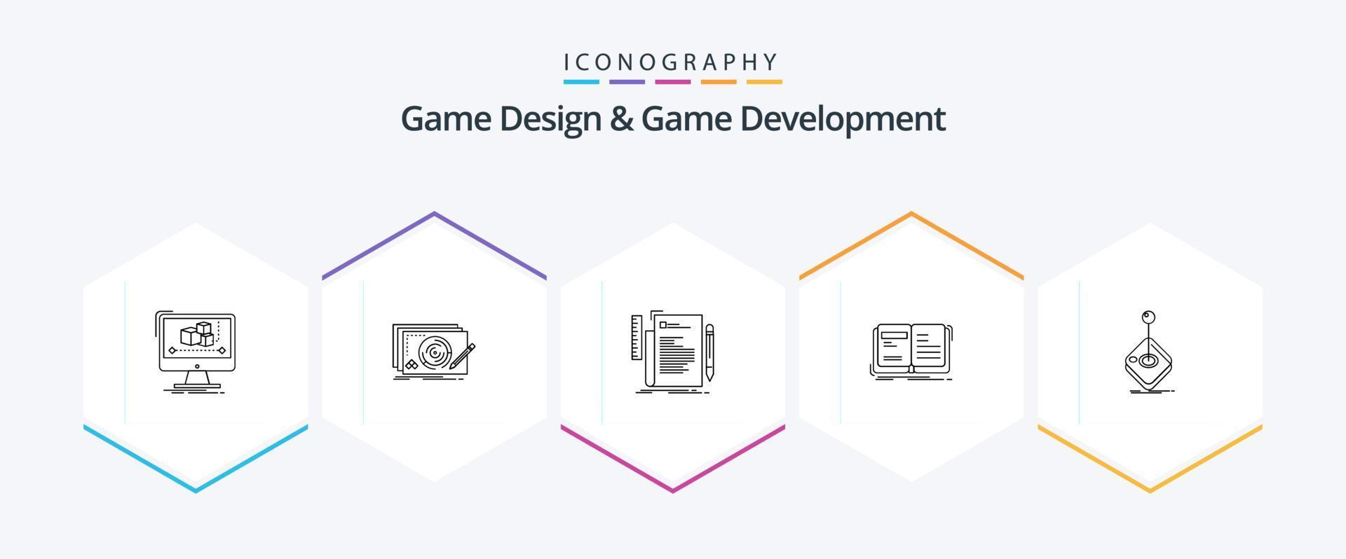 Game Design And Game Development 25 Line icon pack including open. author. complete. script. file Free Vector