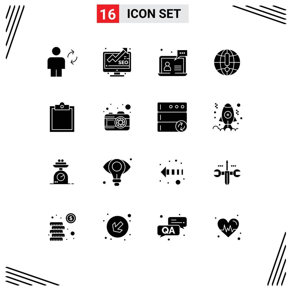 Set of 16 Vector Solid Glyphs on Grid for world internet seo globe customer Editable Vector Design Elements