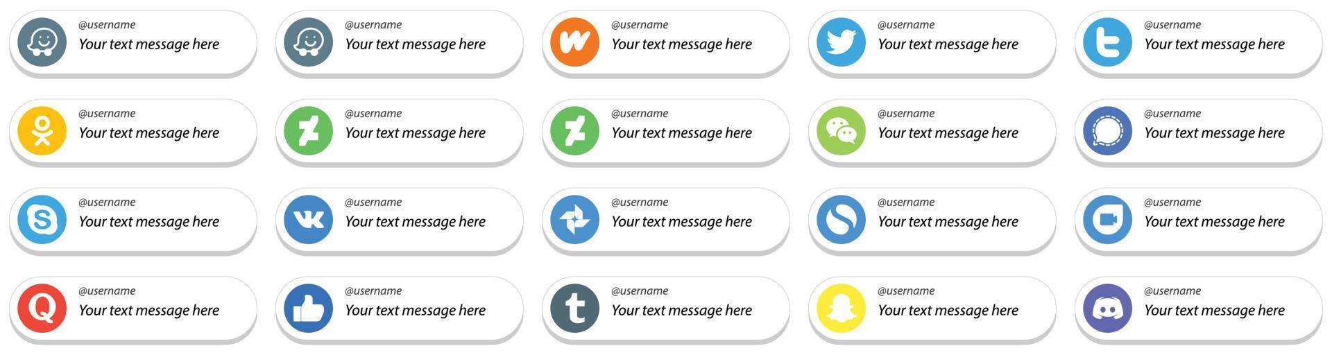 20 High Resolution Card Style Follow Me Social Media Icons with Custom Message Option such as google duo. google photo. messenger. vk and skype icons. Customizable and unique vector