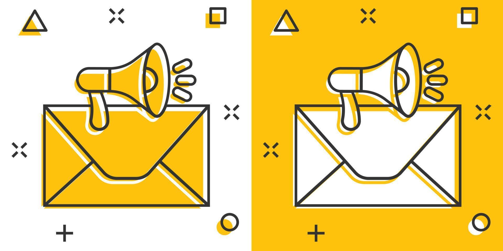 Envelope notification icon in comic style. Email with speaker cartoon vector illustration on white isolated background. Receive mail message splash effect business concept. Pro Vector