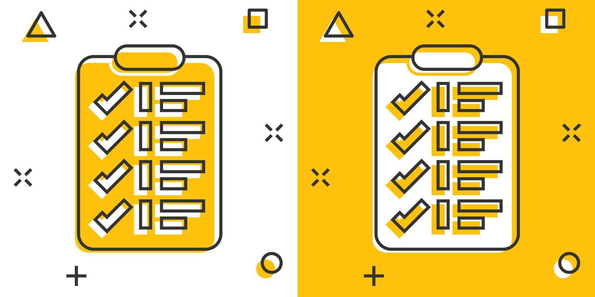 To do list icon in comic style. Document checklist cartoon vector illustration on white isolated background. Notepad check mark splash effect business concept. Pro Vector