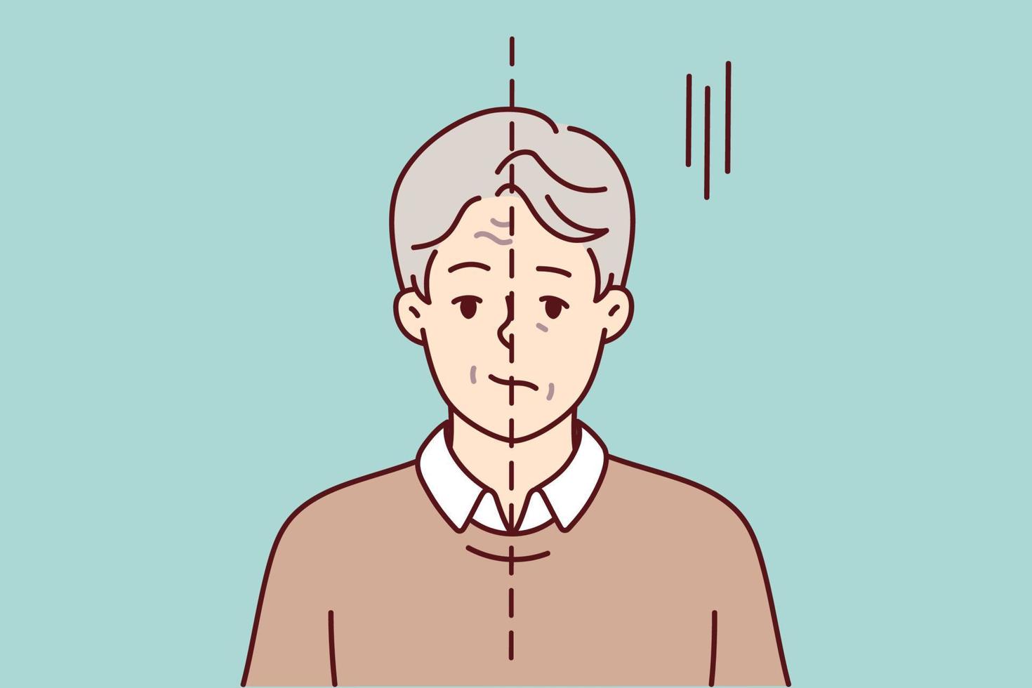 Lonely man smiling and sad at same time experiencing psychological problems. Guy with dividing line on face before and after going to psychologist or taking antidepressants. Flat vector design Pro Vector