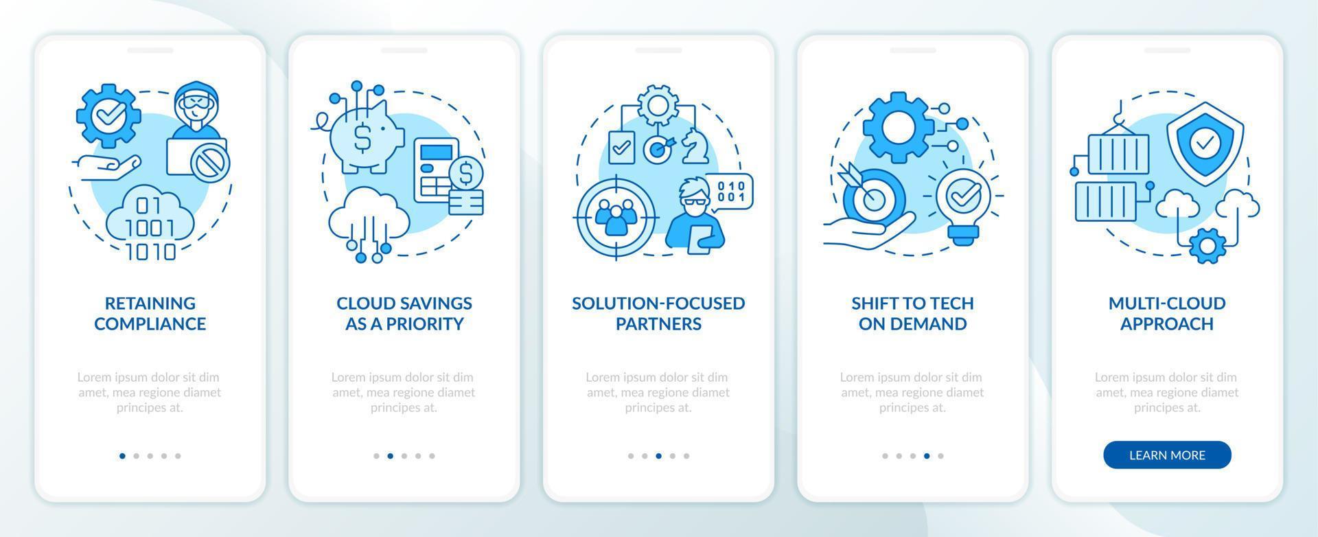 Cloud computing trends benefits blue onboarding mobile app screen. Walkthrough 5 steps editable graphic instructions with linear concepts. UI, UX, GUI template. Myriad Pro-Bold, Regular fonts used Pro Vector