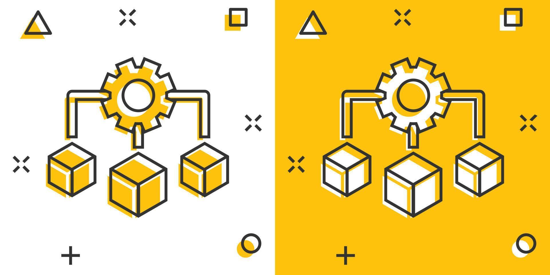 Api technology icon in comic style. Algorithm cartoon vector illustration on white isolated background. Gear with arrow splash effect business concept. Pro Vector