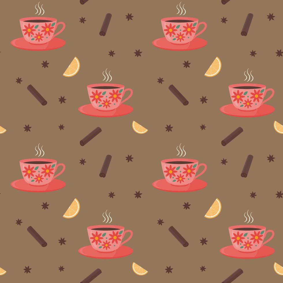 Seamless pattern with cup, cinnamon and lemon. Vector pattern in a flat view.