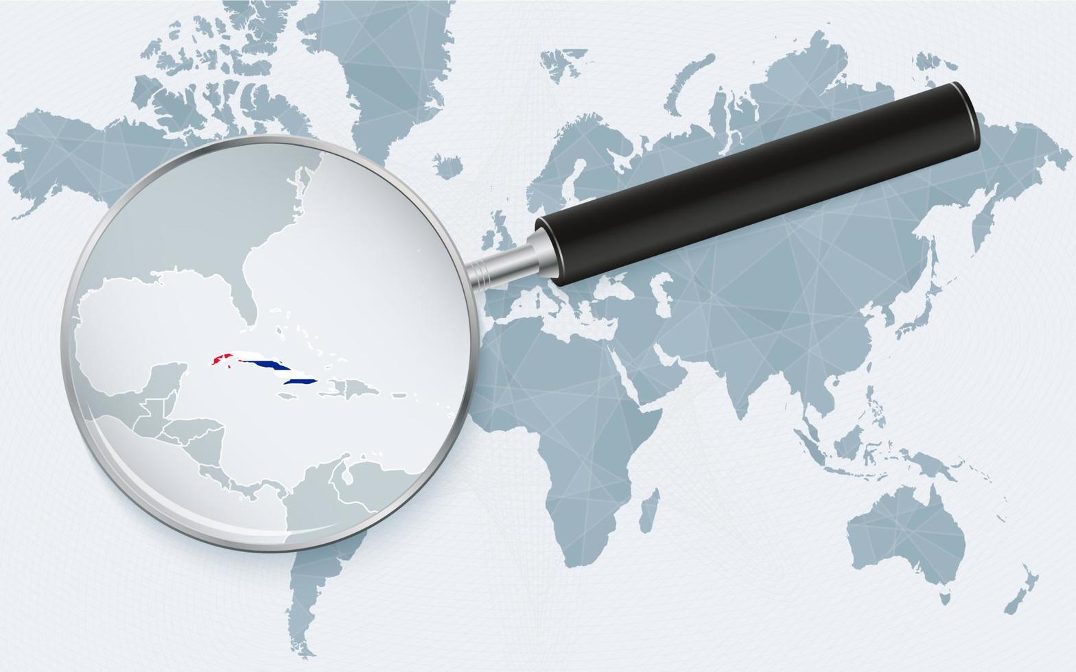 World map with a magnifying glass pointing at Cuba. Map of Cuba with the flag in the loop. Pro Vector