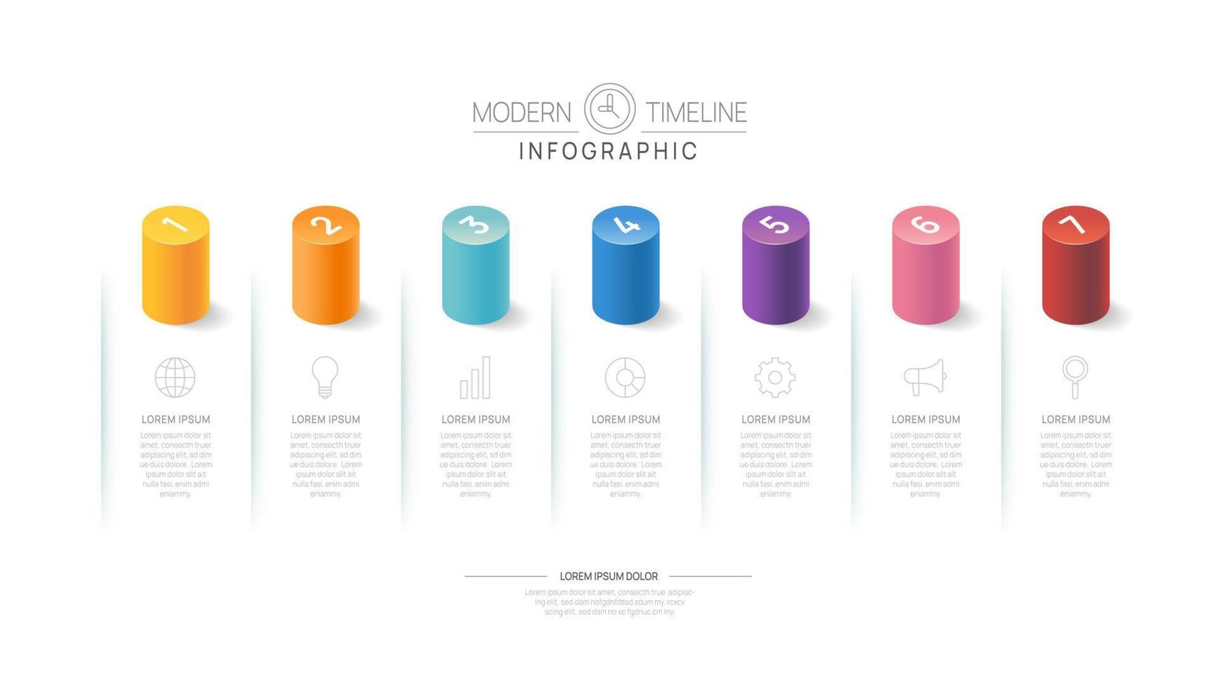 Infographic Timeline diagram template for business. 7 Steps Modern roadmap with cylindrical topics, for vector infographics, flow charts, presentations. Pro Vector