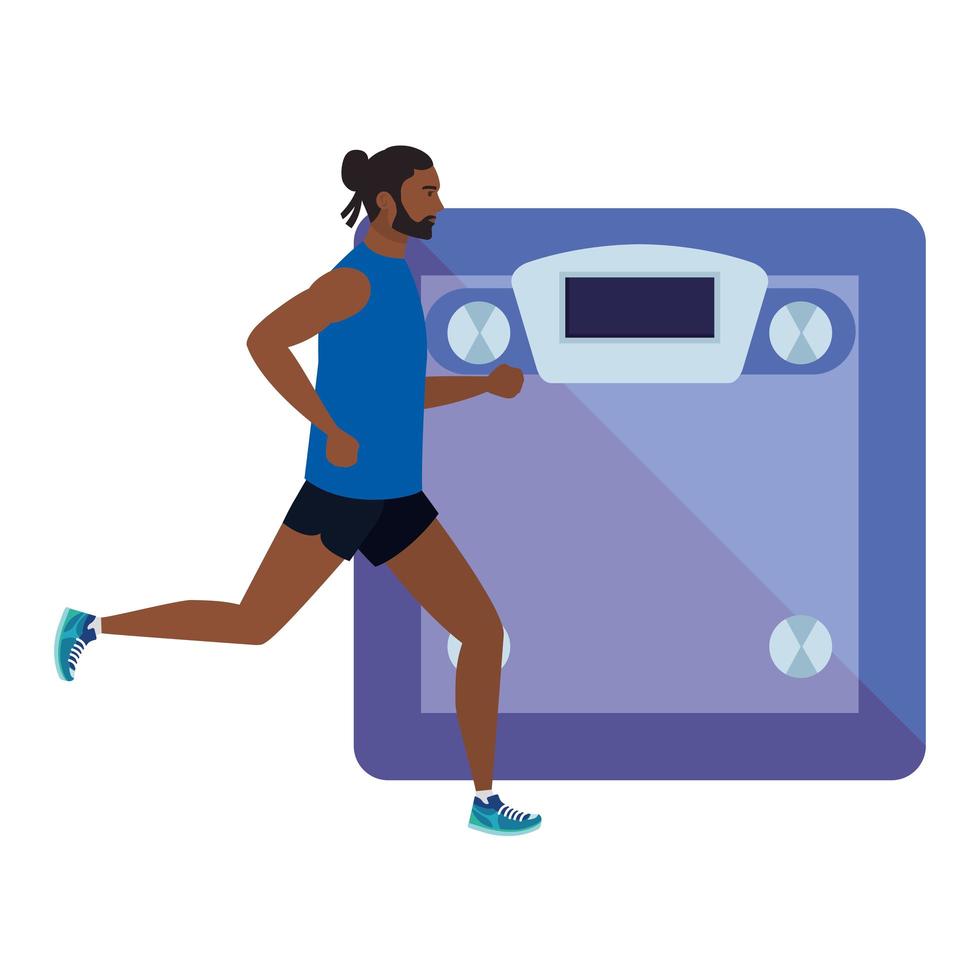 man afro running with weighing scale background, male afro athlete with weighing machine on white background vector
