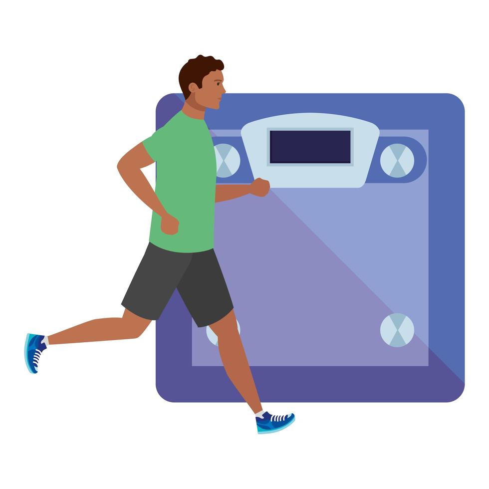 man afro running with weighing scale background, male afro athlete with weighing machine on white background vector