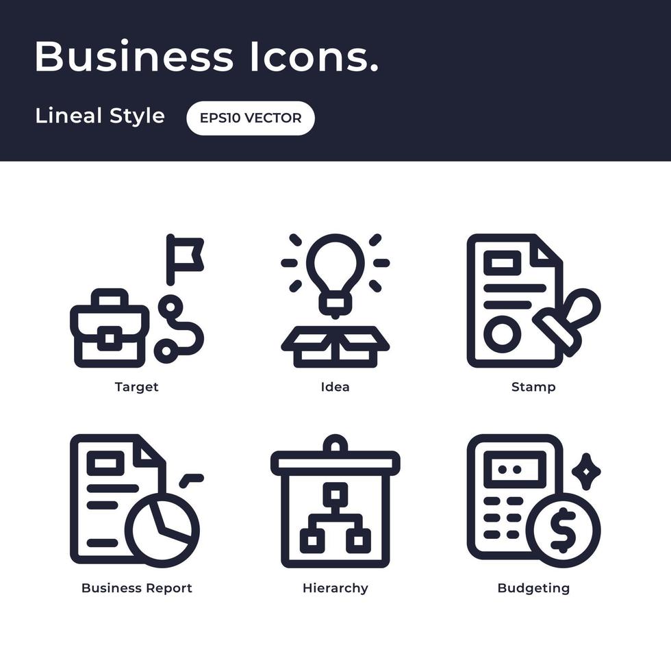 Business icons set with outline style with business target, idea, stamp, business report, hierarchy, budgeting Free Vector