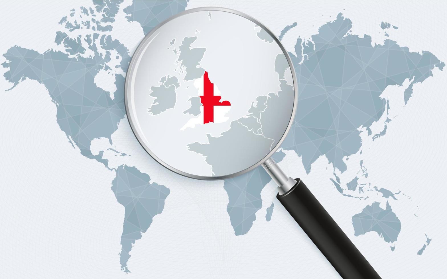 World map with a magnifying glass pointing at England. Map of England with the flag in the loop. Pro Vector