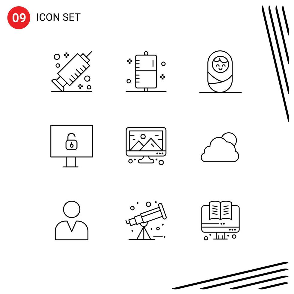 Mobile Interface Outline Set of 9 Pictograms of sky computer baby image security Editable Vector Design Elements Free Vector